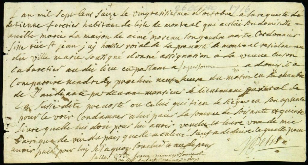 - Procès entre Étienne Forestier, demandeur, et la veuve Cusson, cabaretière, défenderesse, pour le payement d'une barrique de vin
