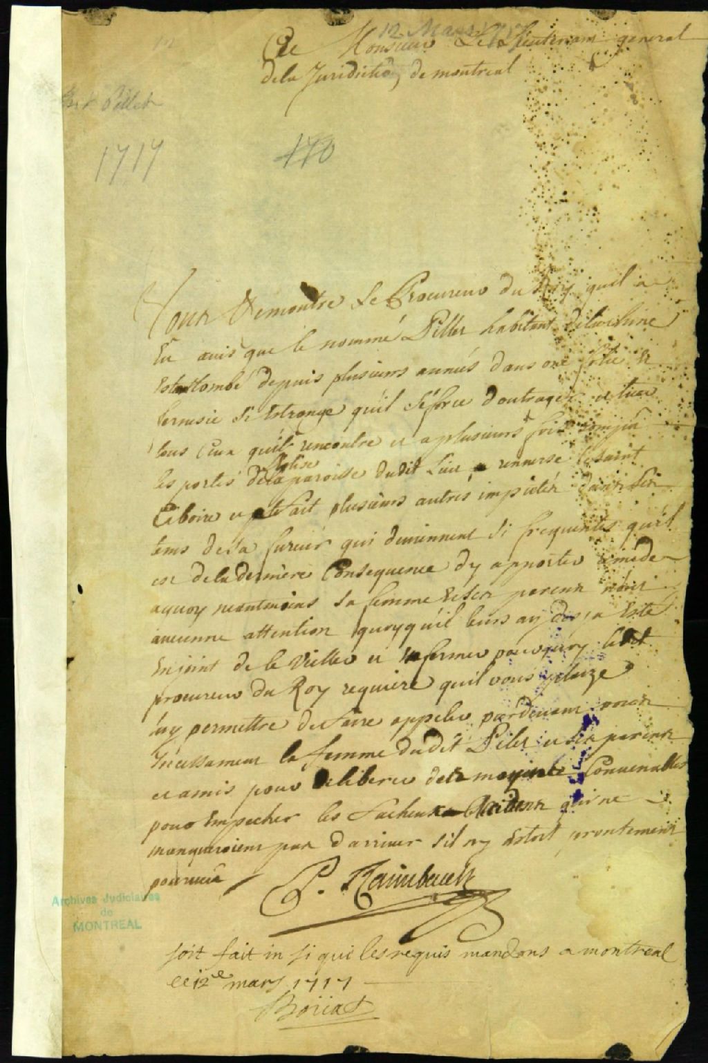 Procès contre la femme de Pilet et sa famille pour la prise de responsabilité des crises de folies dudit Pilet, 12 mars 1717, Archives nationales à Montréal, Fonds Juridiction royale de Montréal, (06M,TL4,S1,D2077).
