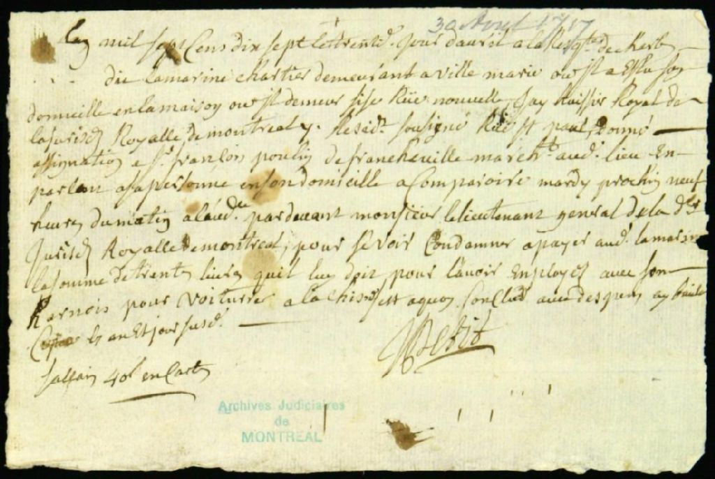 Procès entre le charretier Charles Pitalier dit Lamarine, demandeur, et le marchand François Poulin de Francheville, défendeur, pour payement de charroyage, 30 avril 1717, Archives nationales à Montréal, Fonds Juridiction royale de Montréal, (06M,TL4,S1,D2088).
