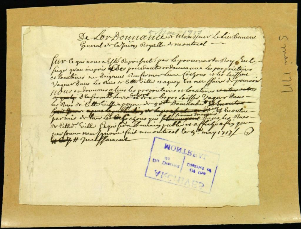 Ordonnance concernant le contrôle des cochons, 5 mai 1717, Archives nationales à Montréal, Fonds Juridiction royale de Montréal, (06M,TL4,S1,D2094).