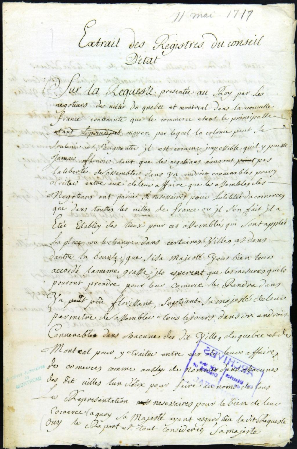 - Ce dossier d'administration royale est composé de l'extrait des registres du Conseil d'État pour l'établissement d'un lieu d'échange ou d'une bourse pour les négociants, à Montréal et à Québec, par assentiment royal. L'enregistrement au Conseil Supérieur de Québec complète le dossier