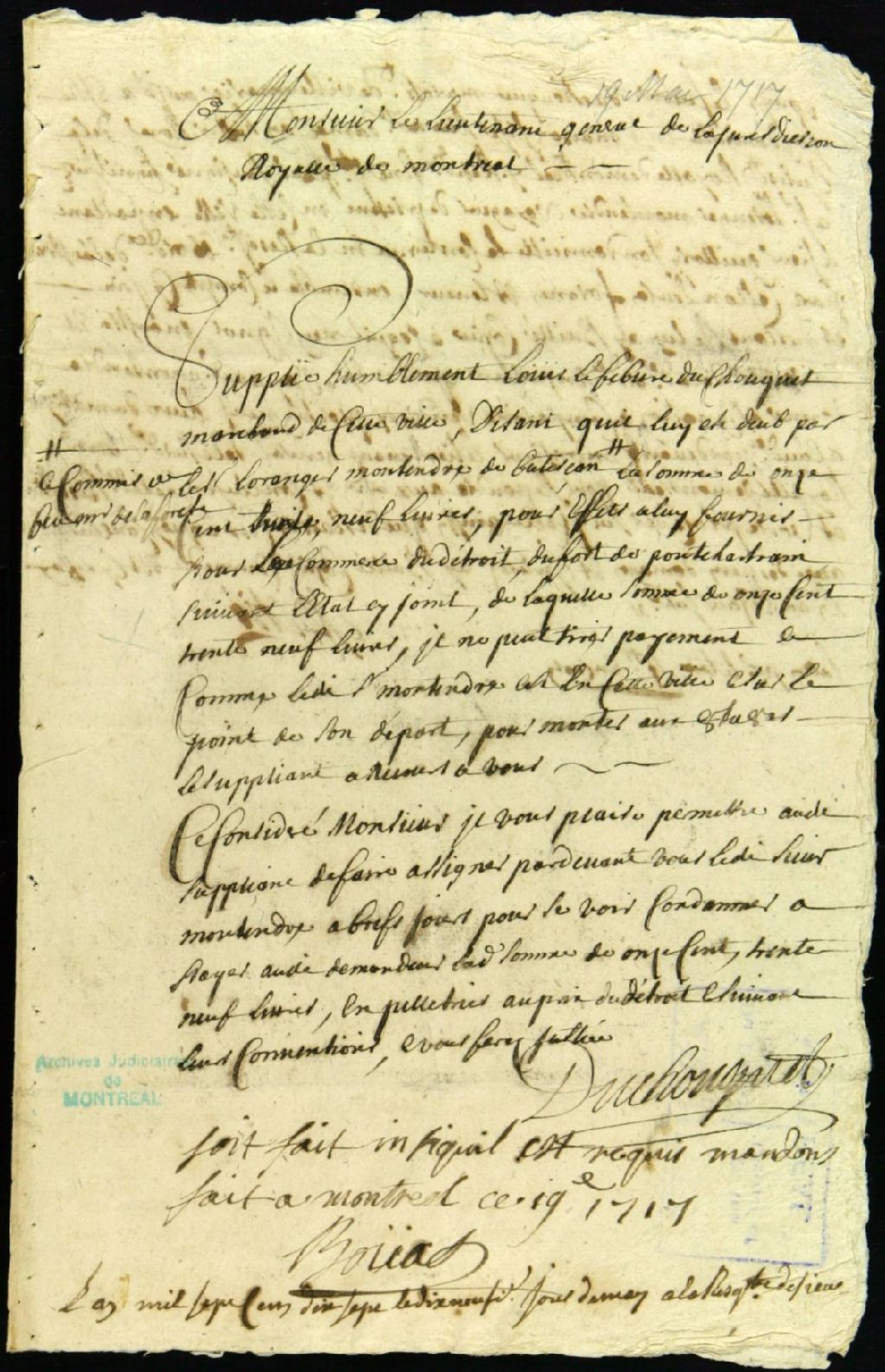 Procès entre Louis Lefebvre dit Duchouquet, marchand, demandeur, et Rivard dit Montendre, voyageur, commis de feu LaForest, défendeur, pour le payement de fournitures, 19 mai 1717, Archives nationales à Montréal, Fonds Juridiction royale de Montréal, (06M,TL4,S1,D2103).
