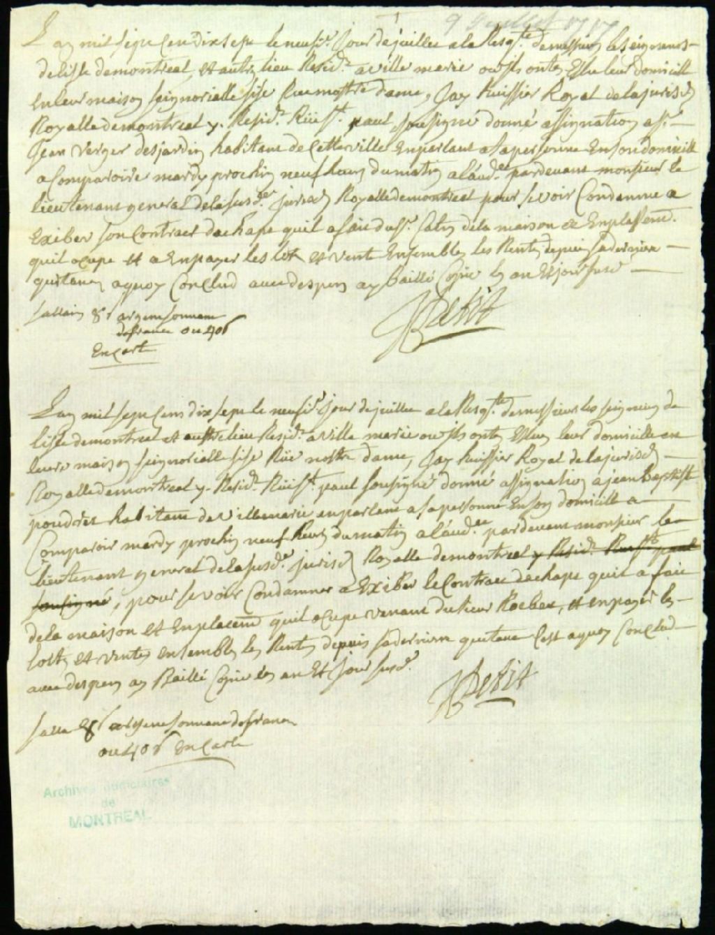 Procès entre les Seigneurs de Montréal, demandeurs, et Jean Verger dit Desjardins et Jean-Baptiste Poudret, défendeurs, pour le payement de lods et ventes, 9 juillet 1717, Archives nationales à Montréal, Fonds Juridiction royale de Montréal, (06M,TL4,S1,D2129).