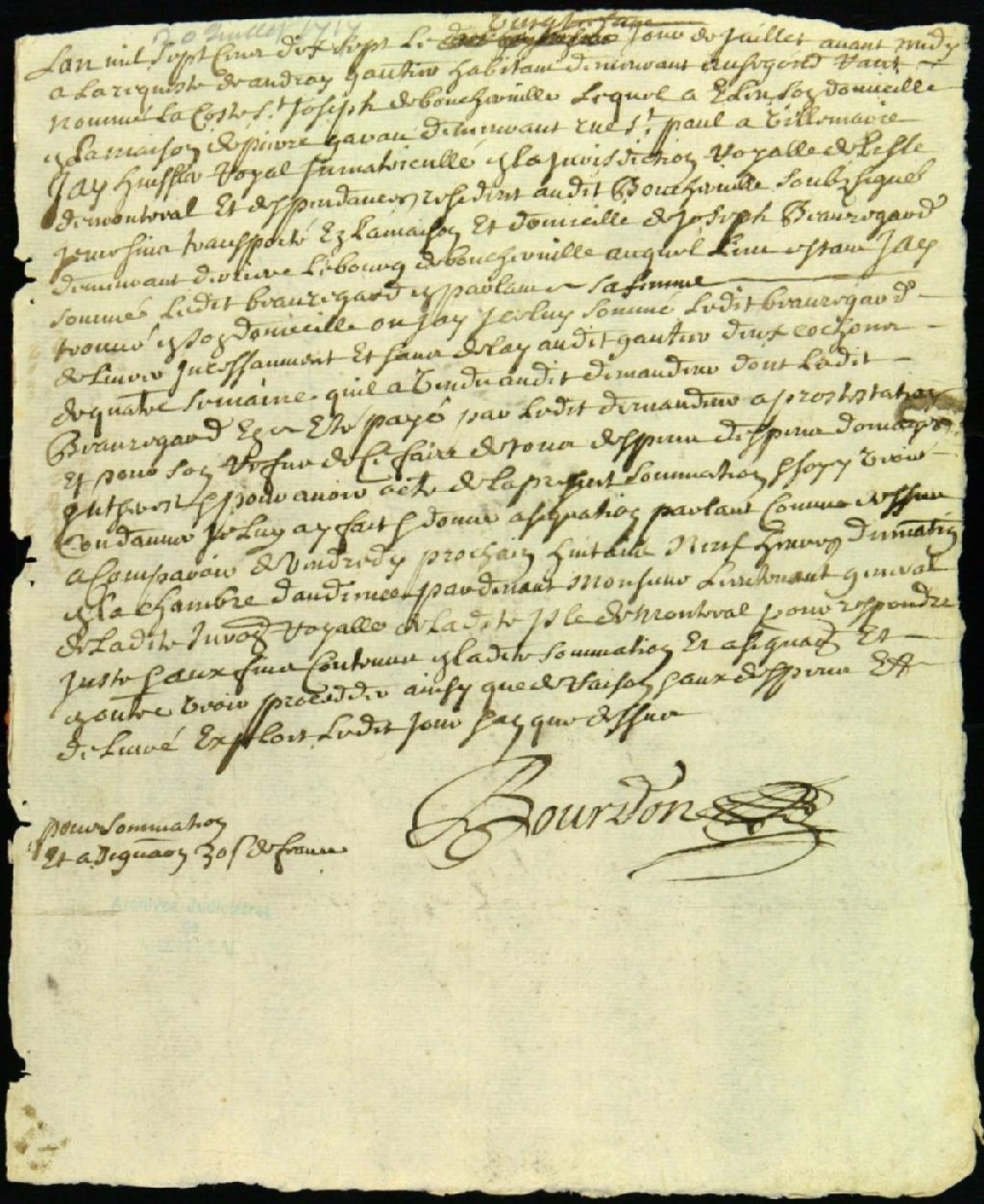 Procès entre André Gauthier, habitant de Boucherville, demandeur, et Joseph Jarret dit Beauregard, défendeur, pour la livraison de jeunes cochons, 20 juillet 1717, Archives nationales à Montréal, Fonds Juridiction royale de Montréal, (06M,TL4,S1,D2144).