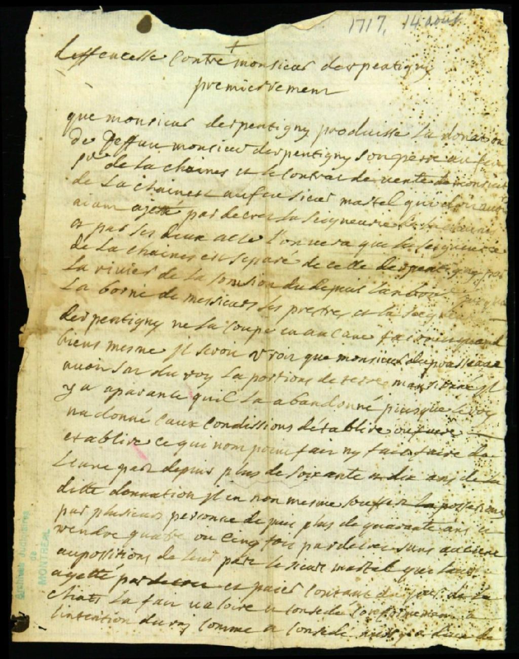 Procès entre Pierre Trottier, sieur Desaulniers, et Pierre Legardeur, fils, seigneur de Repentigny, défendeur, pour le règlement de la succesion de feu Raymond Martel, seigneur de Lachenaie, 14 août 1717, Archives nationales à Montréal, Fonds Juridiction royale de Montréal, (06M,TL4,S1,D2160).
