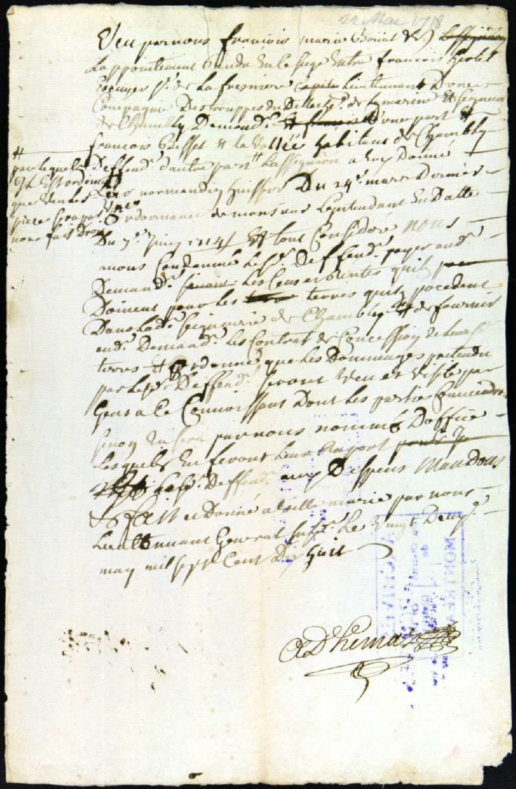 Procès entre François Hertel, sieur de LaFresnière, seigneur, demandeur, et François Besset et Legrain dit Lavallée, habitants de Chambly, défendeurs, pour le paiement de cens et rentes, 22 mai 1718, Archives nationales à Montréal, Fonds Juridiction royale de Montréal, (06M,TL4,S1,D2242).