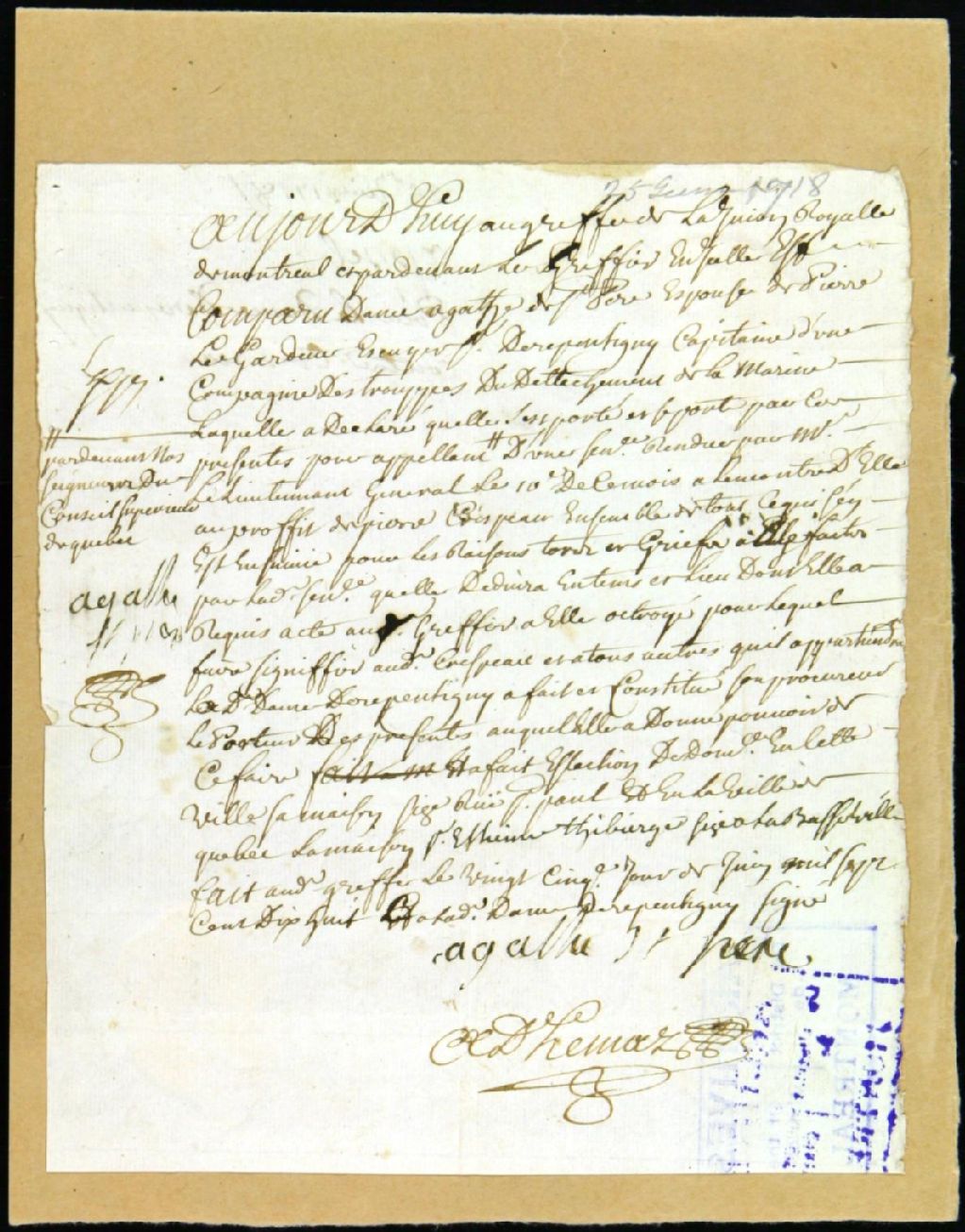 Procès en appel entre Agathe de Saint-Père, épouse de Legardeur, sieur de Repentigny, requérante, et Pierre Crépeau, intimé, 25 juin 1718, Archives nationales à Montréal, Fonds Juridiction royale de Montréal, (06M,TL4,S1,D2248).