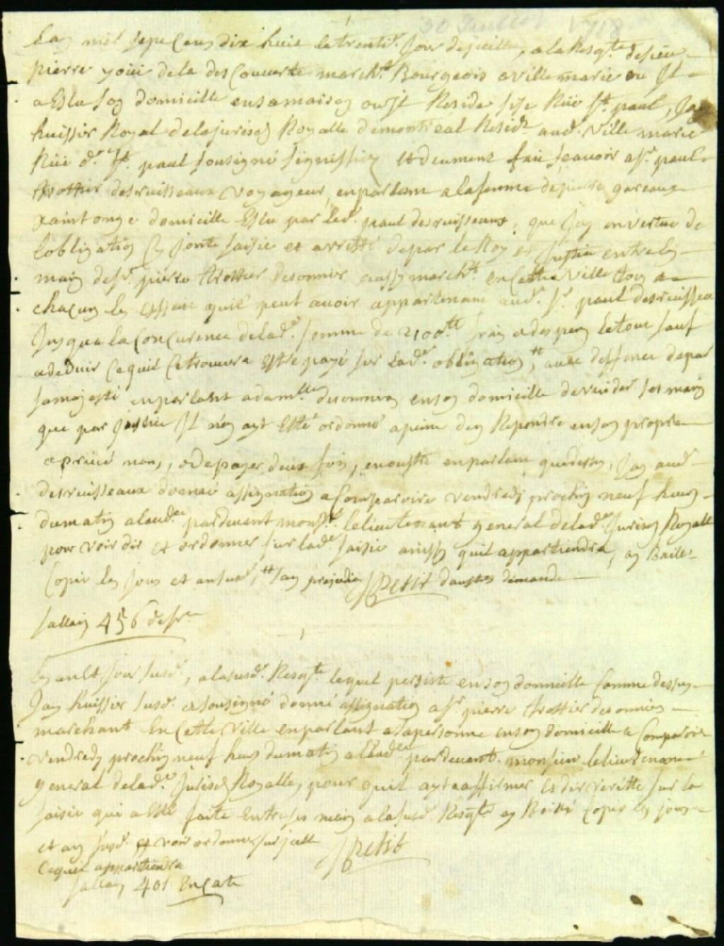 Procès entre Pierre You, sieur LaDécouverte, marchand, bourgeois, demandeur, et Pierre Trottier, sieur DesRuisseaux, voyageur, défendeur, pour une saisie sur dettes, 30 juillet 1718, Archives nationales à Montréal, Fonds Juridiction royale de Montréal, (06M,TL4,S1,D2265).