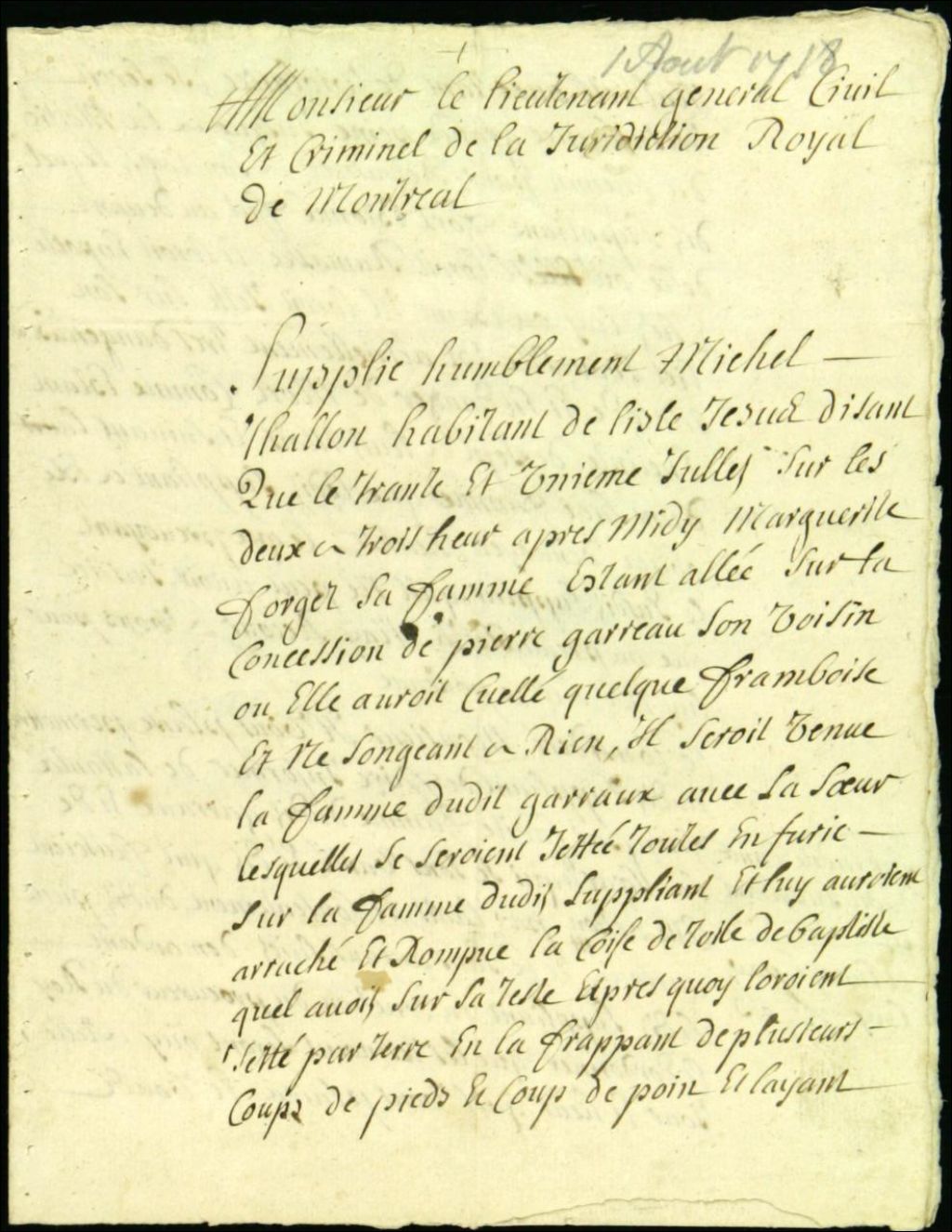 - Ce dossier de matière criminelle est composé des pièces suivantes : la plainte et la requête de Michel pour la tenue d'une information judiciaire concernant l'agression et les coups portés contre sa femme, Marie Forget, blessée par sa voisine, Madeleine Renaud, alors que la première cueillait des framboises dans la propriété de la seconde ; la permission de faire informer et d'assigner les témoins du plaignant ; le rapport du maître chirurgien Henri Bélisle sur l'état de Marie Forget, enceinte ; l'ordre d'assigner les témoins du plaignant ; l'assignation à ceux-ci ; l'information judiciaire ; la communication au procureur du roi, lequel requiert comparution de l'accusée ; le décret de comparution à celle-ci ; l'interrogatoire de Renaud ; l'ordre d'ouïr Marie Mezeray, épouse de Paris dit Jolicoeur, âgée de 40 ans, faisant les fonctions de sage-femme ; la comparution de cette dernière ; les conclusions et le réquisitoire du procureur du roi pour cinquante livres d'amende à Madeleine Renaud ; le jugement ; et le mémoire de frais. Plusieurs témoins sont mentionnés dans ces documents : Élisabeth Bastien, épouse de Louis Leclerc, âgée de 20 ans, et Marguerite Charles, épouse de François Dubois, âgée de 33 ans