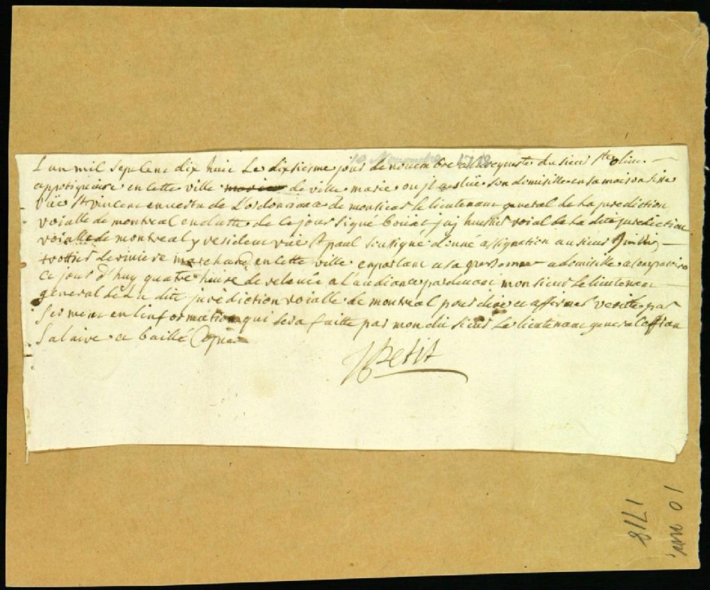 - Ce dossier de matière criminelle est composé des pièces suivantes : le procès-verbal de la rébellion du sieur de Lusignan contre l'huissier Jean Petit, lequel tentait de lui signifier une sentence lui ordonnant de payer le sieur de Saint-Olive ; la plainte de ce dernier à l'effet qu'il a été insulté, jeté à terre et roué de coups de canne par le sieur de Lusignan. Il se plaint également de la rébellion faite par de Lusignan contre l'huissier Jean Petit. Il demande par l'intermédiaire de sa femme, Madeleine Nafrechou, de se faire visiter par un chirurgien. Le dossier contient aussi : la permission de faire assigner les témoins du plaignant ; l'ordre d'assigner ces derniers ; les nombreuses assignations qui s¿en suivent ; le rapport du chirurgien Pierre Puybaro sur l'état de santé de Saint-Olive ; les informations judiciaires ; les requêtes pour la répétition de la déclaration de rébellion de Jean Petit et de Saint-Olive pour faire ouïr d'autres témoins ; l'accord du lieutenant général ; l'ordre de réassigner les témoins de l'accusation ; les réassignations multiples ; la répétition du procès-verbal de rébellion de Jean Petit ; la requête pour " l'adjournement" de Lusignan ; l'ordre dudit " adjournement "; et le mémoire de frais.Les documents mentionnent les témoins suivant : Jean-Baptiste d'Ailleboust des Musseaux, âgé de 48 ans ; Julien Trottier, marchand, âgé de 29 ans ; Jacques Charbonnier, âgé de 46 ans ; Anne Picard, épouse d'Ailleboust des Musseaux ; Marie-Catherine d'Ailleboust des Musseaux, âgée de 24 ans ; François-Daniel d'Ailleboust des Musseaux, âgé de 17 ans ; Anne d'Ailleboust des Musseaux, âgée de 18 ans ; [Marie-Anne Faye?], âgée de 27 ans ; Angélique d'Ailleboust des Musseaux, âgée de 15 ans ; Angélique Lanthier, âgée de 14 ans, servante chez dame Arnaud ; Angélique Haguenier, âgée de 20 ans ; Nicolas-Marie d'Ailleboust des Musseaux, âgé de 25 ans ; Jean-Baptiste Tétreau, marchand, âgé de 36 ans ; Joseph d'Ailleboust de Mantet, fils ; et Jeanne Tailhandier, âgée de 27 ans, épouse de Jean-Baptiste Tétreau
