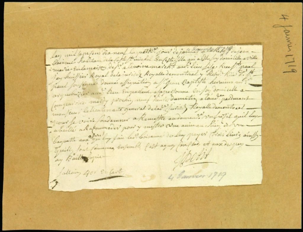 Procès entre Jean Boesmé, habitant de Côte-Saint-Michel, demandeur, et Jean-Baptiste Hervieux, maître arquebusier, défendeur, pour la restitution d'un fusil et d'une baguette, 4 janvier 1719, Archives nationales à Montréal, Fonds Juridiction royale de Montréal, (06M,TL4,S1,D2315).