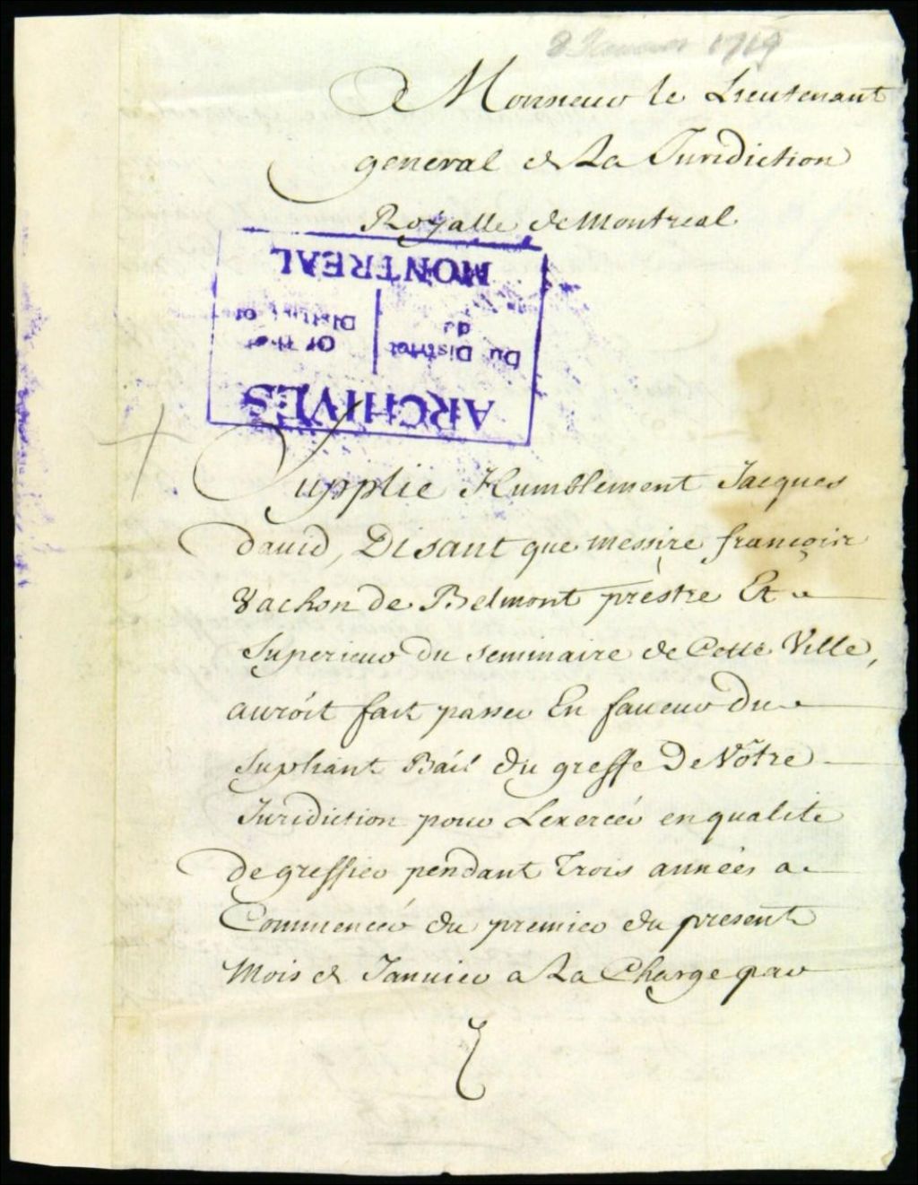 - Ce dossier d'administration civile est composé des pièces suivantes : la requête de Jacques David, lequel a obtenu un bail pour l'office de greffier de François Vachon de Belmont, supérieur du Séminaire, afin de pouvoir exercer la charge de greffier dans la Juridiction royale de Montréal ; la communication au procureur du roi, lequel requiert la tenue d'une information ; l'ordre d'informer ; les assignations à comparaître ; le certificat de religion catholique par le père Rangeard, faisant les fonctions curiales à Ville-Marie ; l'information judiciaire ; l'opinion du procureur du roi ; et l'ordre de réception de Jacques David à titre de greffier et de prestation de serment. Plusieurs témoins sont mentionnés dans ces documents : Gédéon de Catalogne, officier ; Étienne Rocbert, garde-magasin du roi ; et Pierre de Lestage