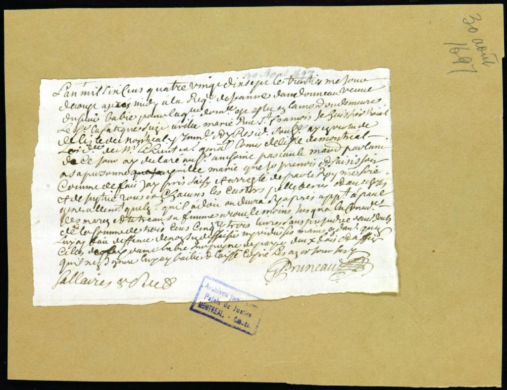 - Ce dossier de matière civile est composé des pièces suivantes : la requête de Jeanne Dandonneau pour mettre en exécution un jugement rendu à Champlain, le 25 novembre 1683, qui condamne Paul Desmarais et Marie Tétreau à lui payer 353 livres ; l'accord du lieutenant général ; la transcription d'un jugement du 17 septembre 1697, en faveur de Mme Babie ; et la saisie de pelleteries appartenant à Paul Desmarais chez le marchand Antoine Pacaud
