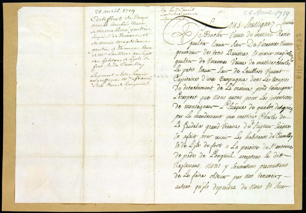 - Ce dossier de matière privée est composé de la pièce suivante : le certificat de Marie Boucher, veuve de René Gauthier, sieur de Varennes, et de Marie-Madeleine Gauthier, veuve du sieur d'Élivilliers, acceptant le règlement de l'évêque de Québec pour la réunification des habitants de l'île du fort et du Tremblay, à la paroisse de Saint-Antoine de Longueuil. Le déposant est François Séré, curé de Longueuil