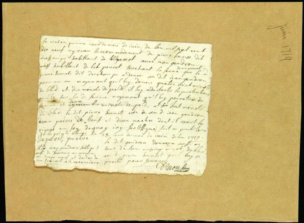 Accord entre Pierre Hunault dit Deschamps, de l'île Perrot, et Jean Gendron, du même endroit, concernant le bail à ferme de [Quenet?], 25 juin 1719, Archives nationales à Montréal, Fonds Juridiction royale de Montréal, (06M,TL4,S1,D2366).