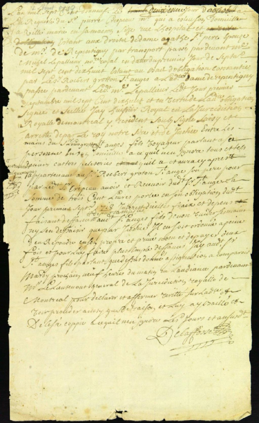 Saisie de pelleteries et de castors qui appartiennent à Robert Groton dit Saint-Ange, par Pierre Crépeau, marchand, pour droits cédés, 2 août 1719, Archives nationales à Montréal, Fonds Juridiction royale de Montréal, (06M,TL4,S1,D2400).