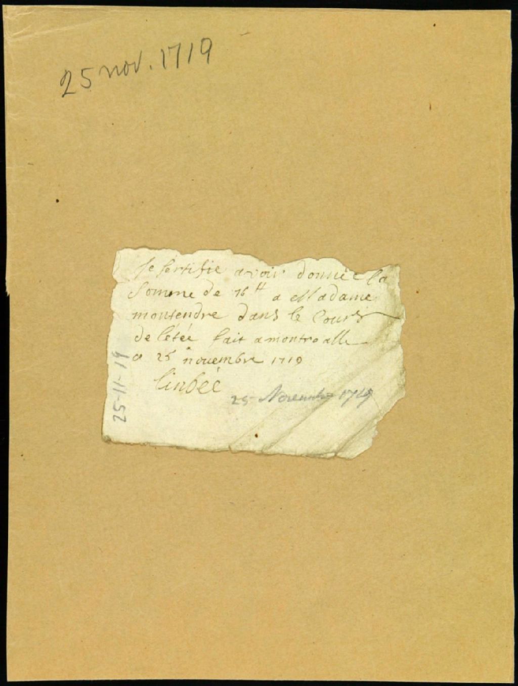 Certificats de remboursement de dettes entre Daveluy dit Larose, Lambeye, Desaulniers et Madeleine Cauchon dit Laverdière, veuve de Véron dit Montendre, épouse de Demers dit Dessermons, 23 novembre 1719 - 28 novembre 1719, Archives nationales à Montréal, Fonds Juridiction royale de Montréal, (06M,TL4,S1,D2441).