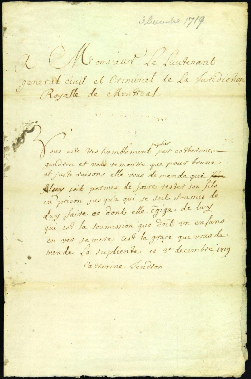 - Ce dossier de matière criminelle est composé de la pièce suivante : la requête de Catherine Gendron pour retenir son fils en prison jusqu'à ce qu'il se soumette à l'autorité de sa mère