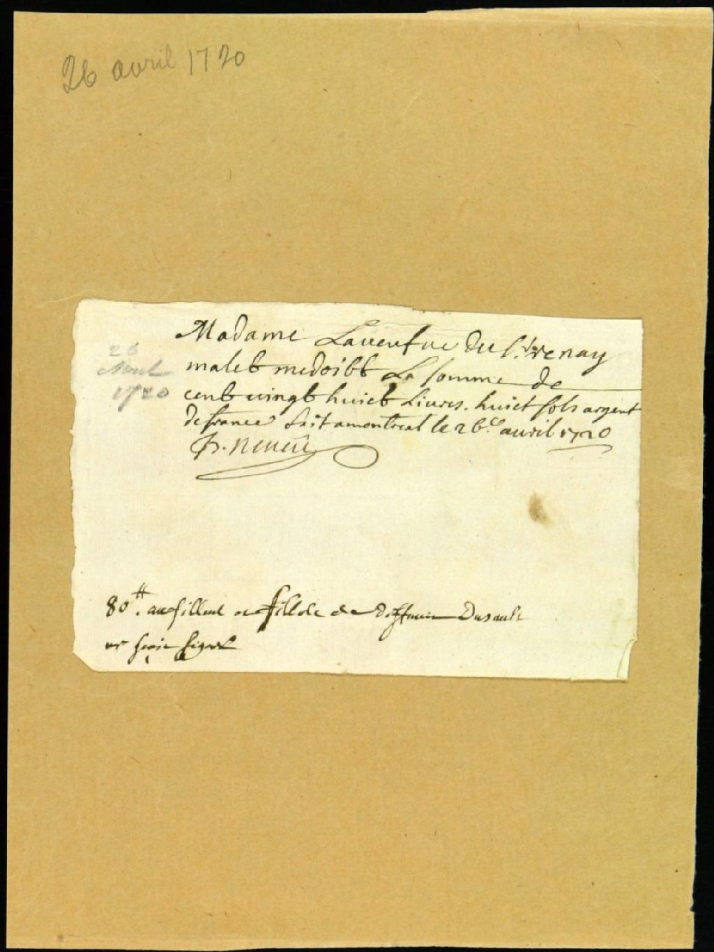 Billet de Jean-Baptiste Neveu à René Mallet pour dette, 26 avril 1720, Archives nationales à Montréal, Fonds Juridiction royale de Montréal, (06M,TL4,S1,D2470).