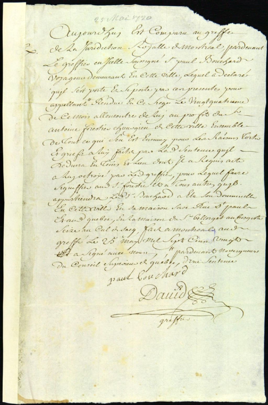 Procès en appel entre Paul Bouchard, voyageur, requérant, et Antoine Forestier, chirurgien, intimé, 25 mai 1720, Archives nationales à Montréal, Fonds Juridiction royale de Montréal, (06M,TL4,S1,D2480).