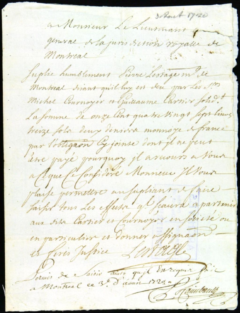 - Procès entre Pierre de Lestage, marchand de Montréal, demandeur, Michel Hertel de Cournoyer et Guillaume Cartier, voyageurs, tous deux défendeurs pour paiement d'une obligation