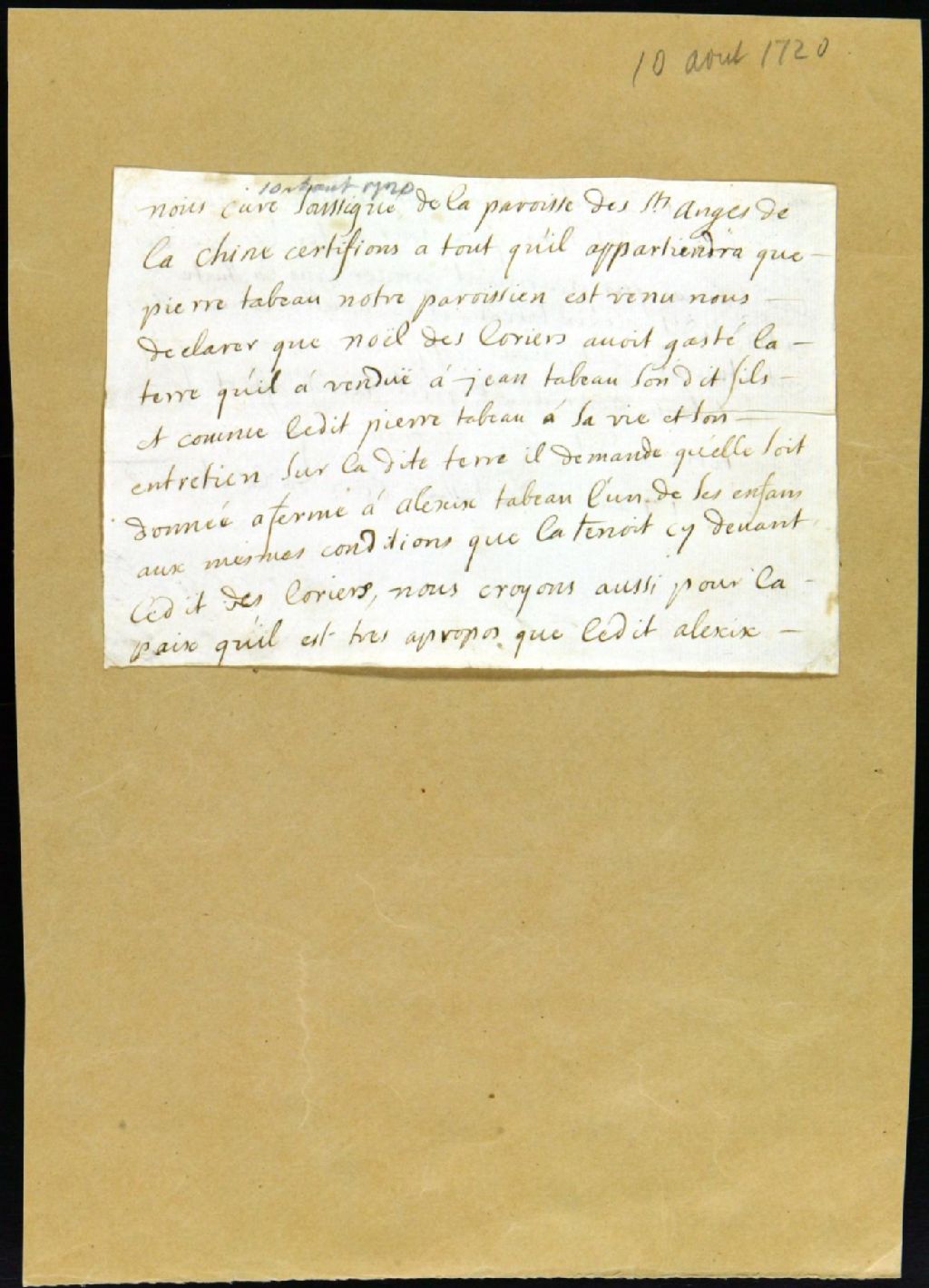 Procès entre Pierre Tabault, demandeur, et Noël Legault dit Deslauriers, fermier de Jean Tabault, défendeur, pour versement des fermages, 10 août 1720 - 13 août 1720, Archives nationales à Montréal, Fonds Juridiction royale de Montréal, (06M,TL4,S1,D2522).