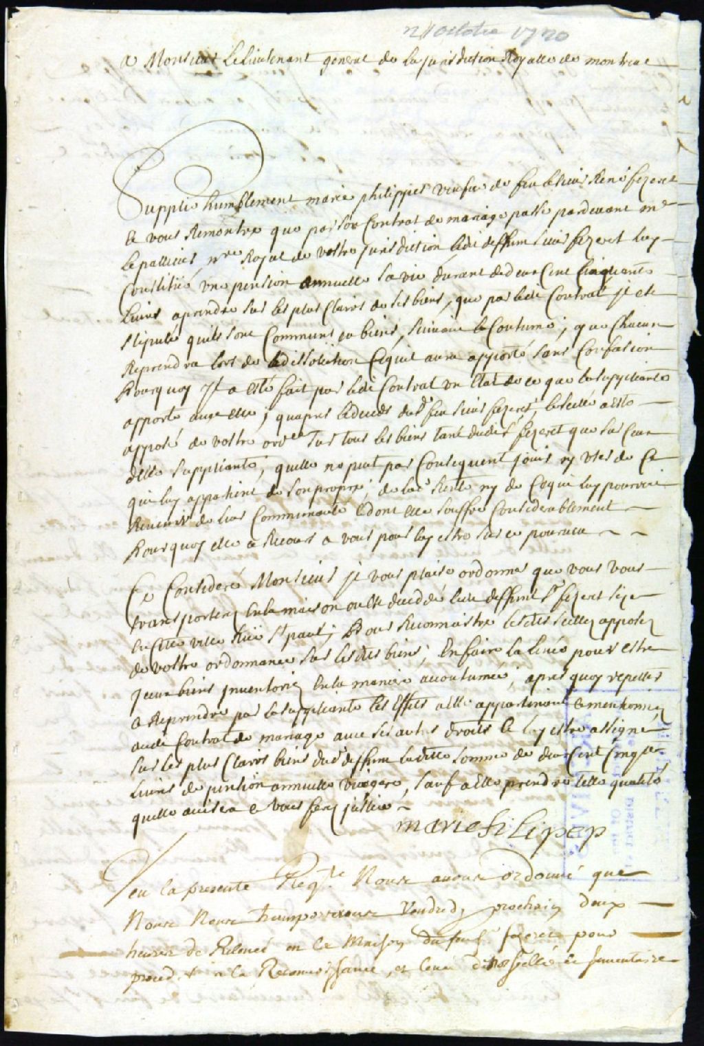 - Ce dossier d'administration judiciaire contient une requête de Philippe pour la levée des scellés apposés sur les biens de son défunt mari, afin qu'elle puisse en faire l'inventaire et toucher sa pension dont elle a besoin pour vivre. On retrouve aussi dans ce dossier l'ordre de Pierre Raimbault, tenant le siège du lieutenant général, de se transporter sur les lieux ; le report de la levée, vu que la requête n'a pas été signifiée à partie ; et la signification à Gabriel de Thiersant, époux de Marie-Rose Fezeret