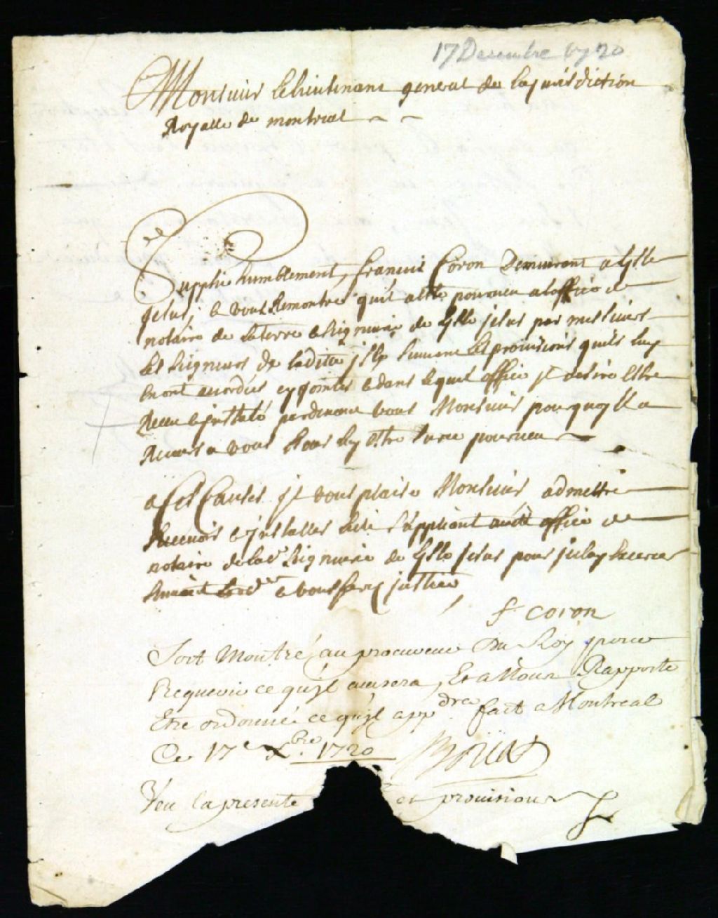 - Ce dossier d'administration civile est composé des pièces suivantes : la requête de François Coron disant être pourvu de l'office de notaire de l'île Jésus, par les seigneurs de l'île, et désirant être reçu comme tel dans la juridiction ; la communication au procureur du roi ; la permission de ce dernier qui «n'empêche» ; et la déclaration écrite du curé Lepage de Sainte-Claire à l'effet que Coron est un honnête homme, bon chrétien et pratiquant