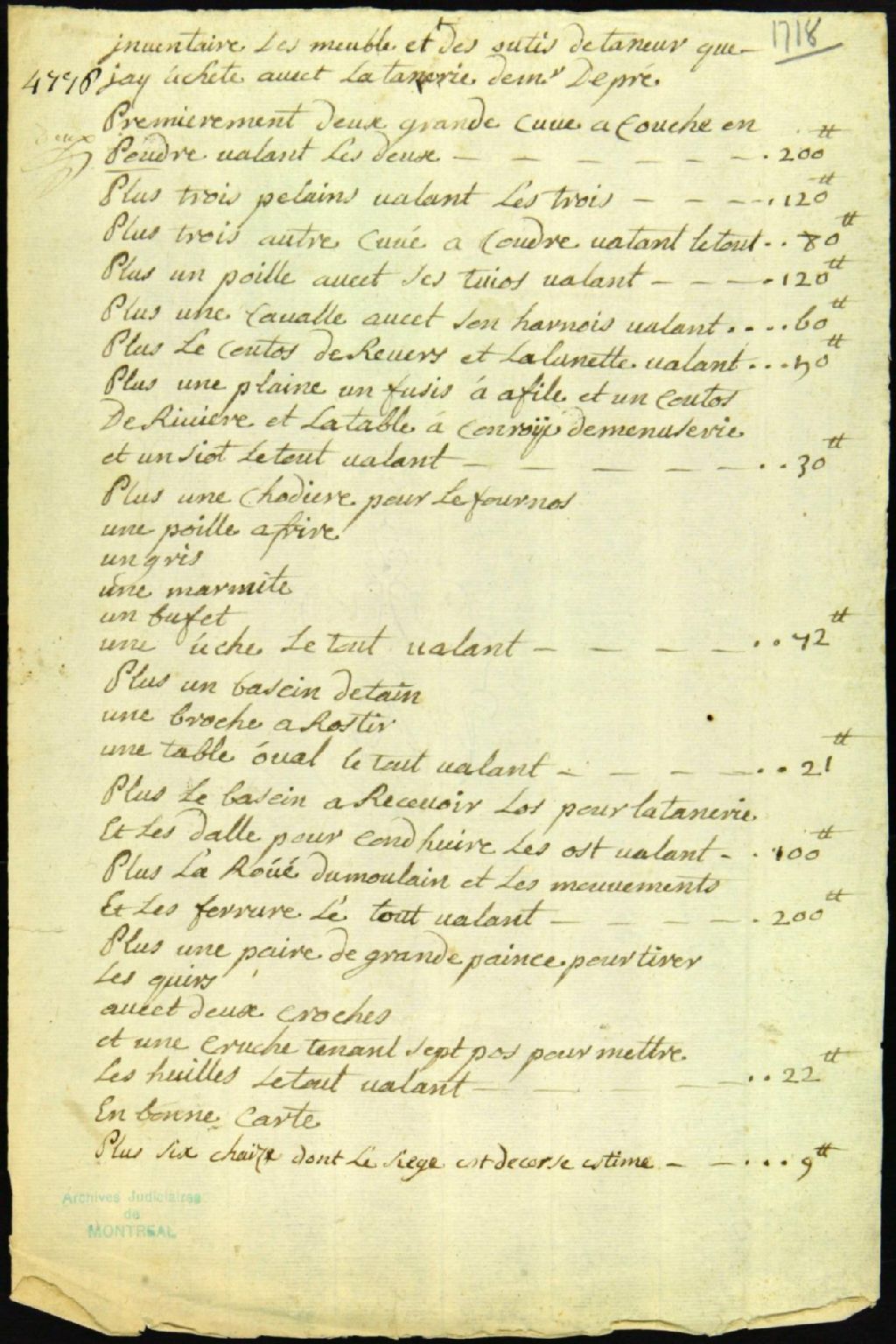 Inventaire d'un achat de meubles et d'outils de tanneur appartenant à [Joseph Guyon Després?], [Vers 1720], Archives nationales à Montréal, Fonds Juridiction royale de Montréal, (06M,TL4,S1,D2589).