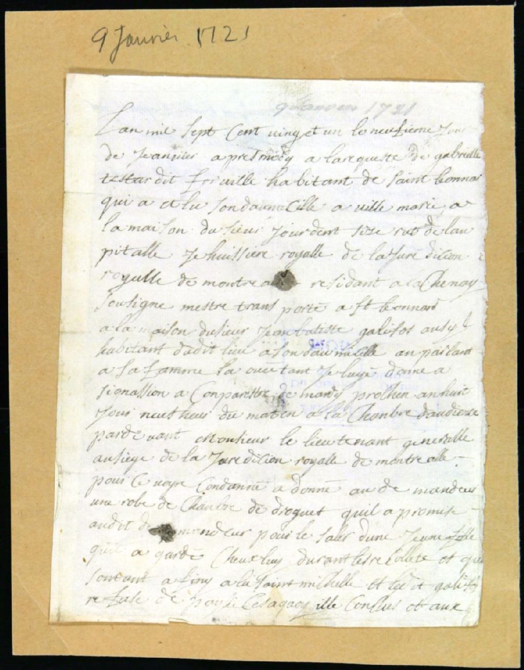 - Ce dossier de matière civile contient l'assignation à comparaître à l'audience à Jean-Baptiste Galipeau à la requête de Gabriel Testard pour donner au demandeur une robe de chambre de droguet qu'il doit pour le salaire d'une jeune fille qui a gardée chez le défendeur durant les récoltes. On retrouve aussi le jugement par défaut contre Galipeau, non comparant