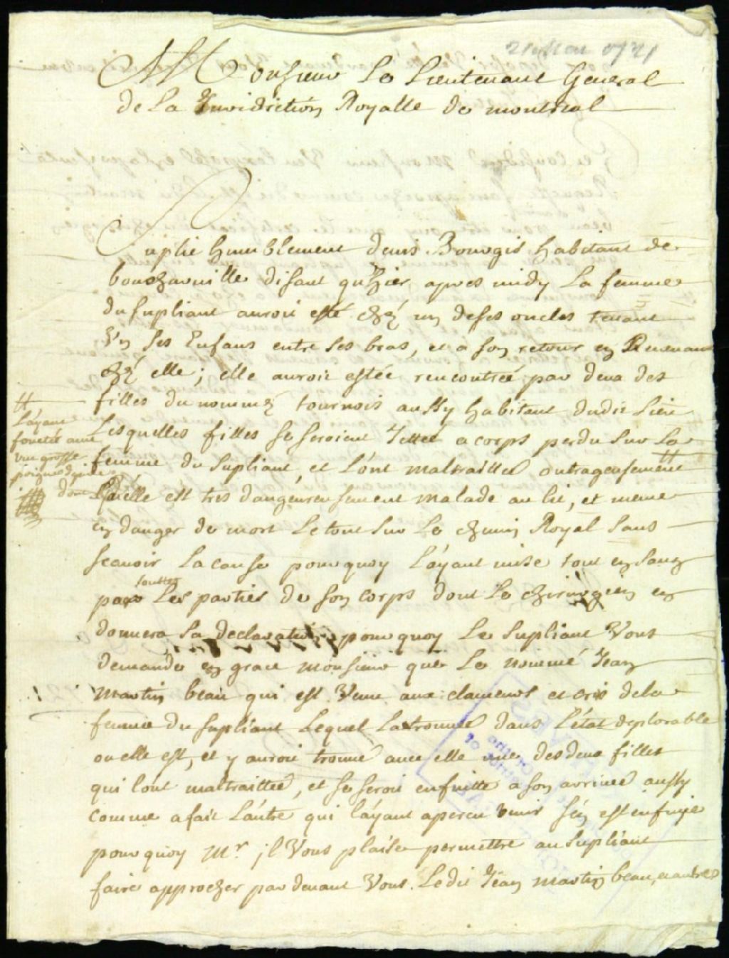 Procès entre Denis Bourgery, habitant de Boucherville, époux de Marie-Josèphe Bau, plaignant, et Madeleine et Geneviève Tournois, filles de Jean, accusées de voies de fait