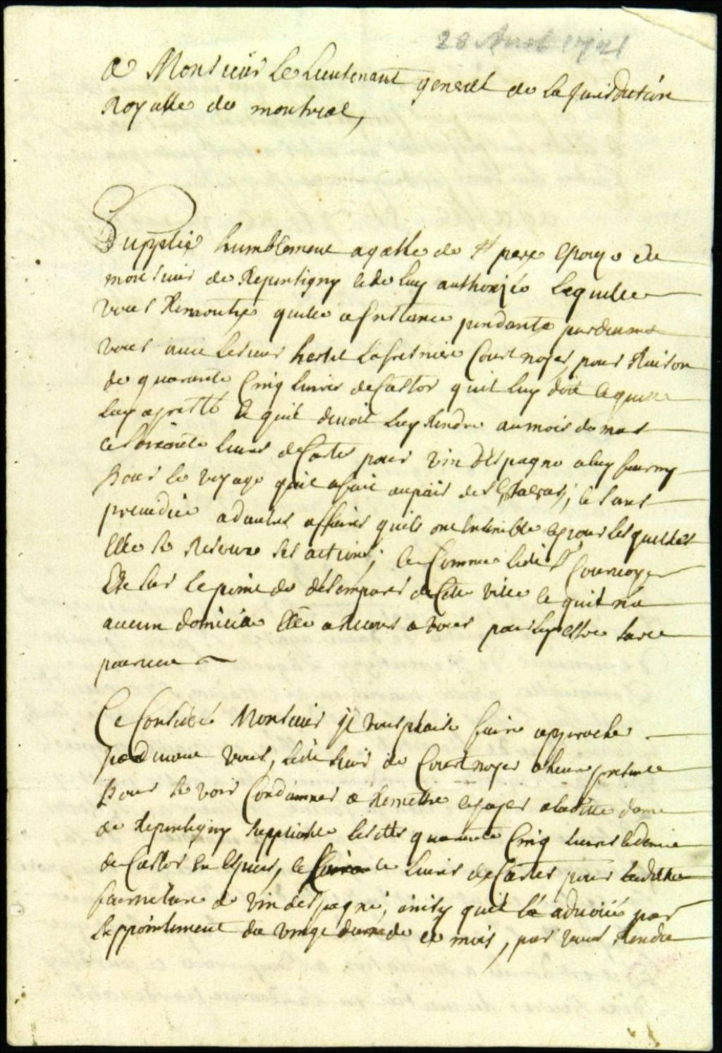 - Ce dossier de matière civile contient la requête d'Agathe de Saint-Père pour faire comparaître Hertel, sieur de Cournoyer, pour payer une dette de 45 livres pour fournitures de voyage au nommé Vindespagne. On retrouve aussi les pièces suivantes : la permission pour la comparution de Cournoyer ; la signification de la requête et l'assignation à comparaître à partie