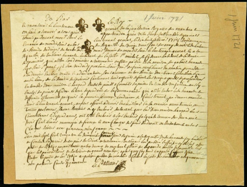 Licitation et adjudication de la terre de Toussaint Hunault, veuf d'Étiennette Paquet, située à la Rivière-des-Prairies, 1 juin 1721 - 16 juin 1721, Archives nationales à Montréal, Fonds Juridiction royale de Montréal, (06M,TL4,S1,D2634).
