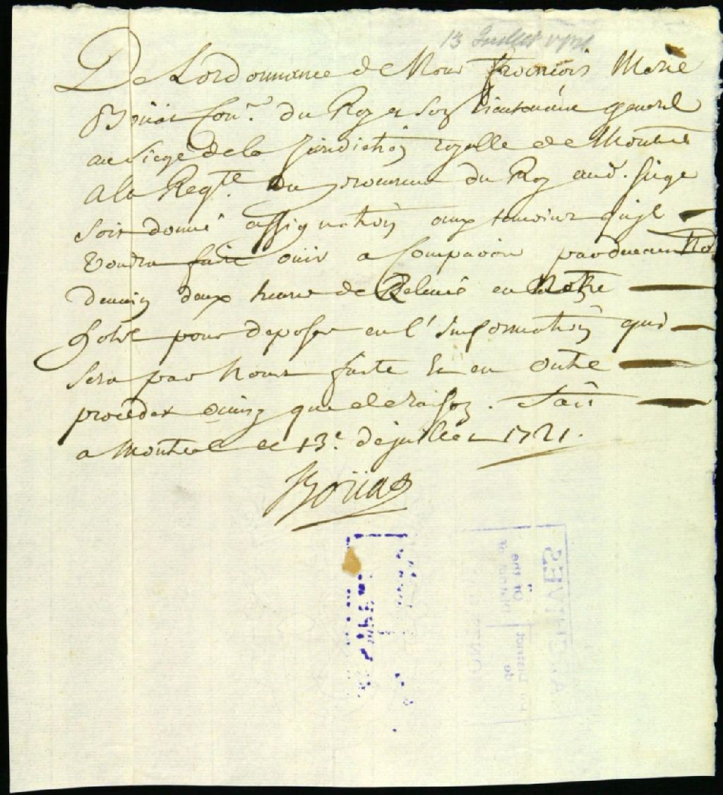 - Ce dossier de matière criminelle est composé des pièces suivantes : la requête pour la tenue d'une information contre Marguerite Verdon, 46 ans, accusée de vendre de la boisson aux sauvages ; l'ordre d'assigner les témoins pour déposer lors d'une information judiciaire ; ladite information ; la communication au procureur du roi ; le réquisitoire ; le décret " d'adjournement" à Marguerite Verdon ; l'assignation ; l'interrogatoire de Verdon disant vendre la boisson pour nourrir sa famille, son mari étant hors d'état de pourvoir ; le jugement qui condamne Marguerite Verdon à cinquante livres d'amende ; et la transcription scellée dudit jugement suivi d'un ordre de payement de l'amende.Les témoins mentionnés dans cette affaire sont : Pierre Darsi dit Saint-Germain, 23 ans, soldat de la Compagnie de Beaujeu ; Gédéon-François de Catalogne, 57 ans, officier ; Thérèse Migeon, 42 ans, épouse de Liénard et Agathe de Saint-Père, 64 ans, épouse de Legardeur