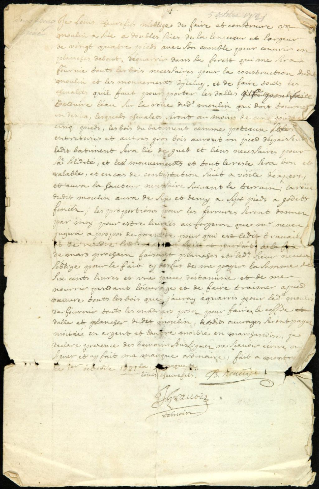 - Ce dossier de matière privé est composé d'un marché sous seing privé entre Louis Chevrefils et B. Neveu pour la construction d'un moulin à double scie de vingt-quatre pieds carrés, pour la somme de 600 livres et autres avantages