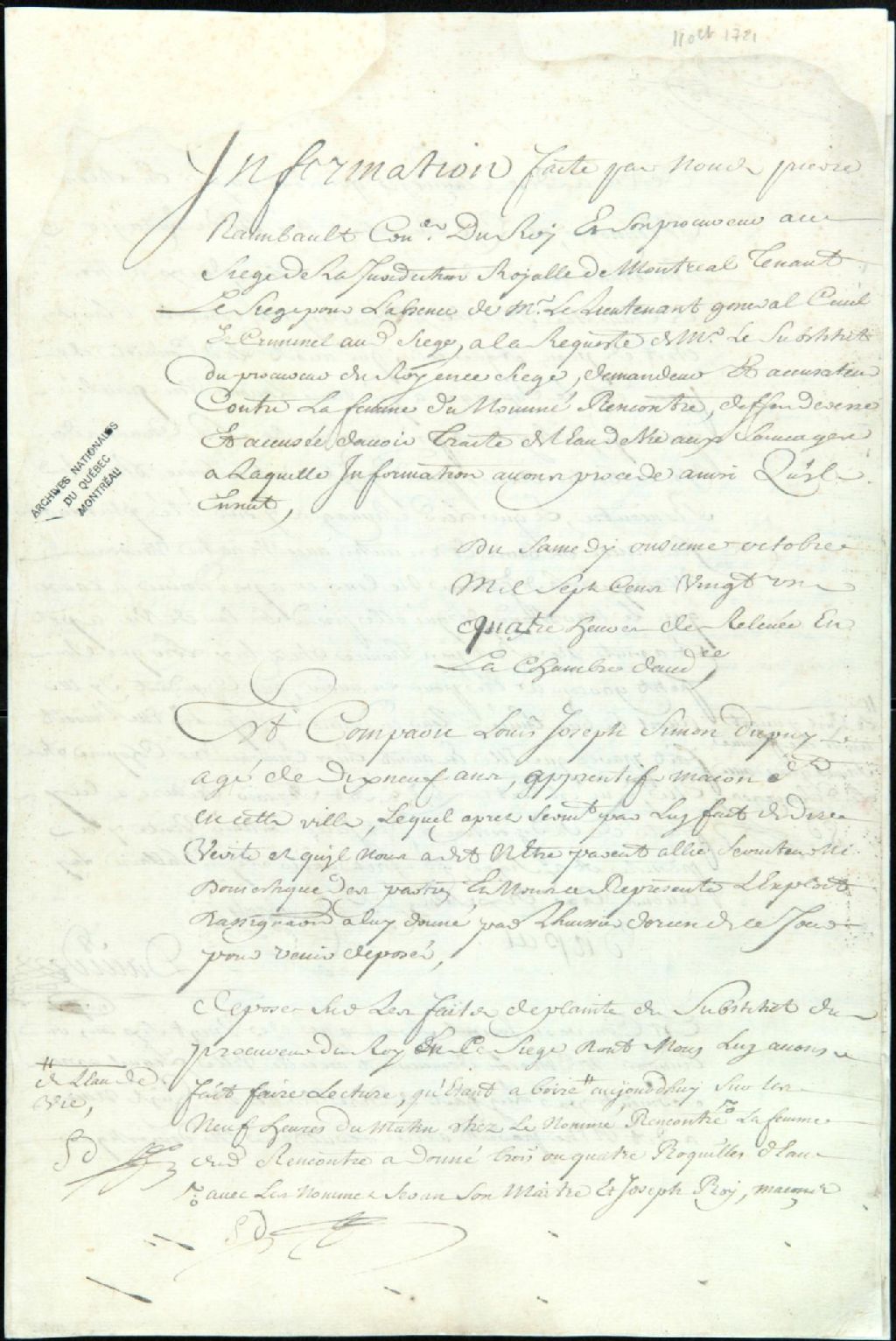 Procès contre Marie-Agathe Buteau, épouse de François Judic dit Rencontre, accusée de vente de boisson aux sauvages, 11 octobre 1721 - 20 octobre 1721, Archives nationales à Montréal, Fonds Juridiction royale de Montréal, (06M,TL4,S1,D2663).