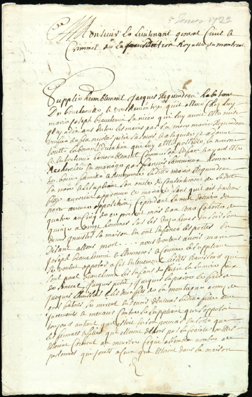 Procès entre Jacques Reguindeau, habitant de Boucherville, plaignant, et Jacques Petit, demeurant chez Jacques Lapierre, Jean-Baptiste Petit dit Lalumière, fils de Paul, Paul Petit dit Beauchemin, frère de Marie-Josèphe, Pierre Lalue dit Lamontagne, Jean-Baptiste et Alexis Sénécal, fils de Nicolas, et Paul Petit dit Lalumière, fils, et "autres", accusés d'avoir tenté d'enlever Marie-Josèphe Petit dit Beauchemin, nièce du plaignant et fille de feu Nicolas Petit, 4 février 1722 - 18 mai 1722, Archives nationales à Montréal, Fonds Juridiction royale de Montréal, (06M,TL4,S1,D2693).