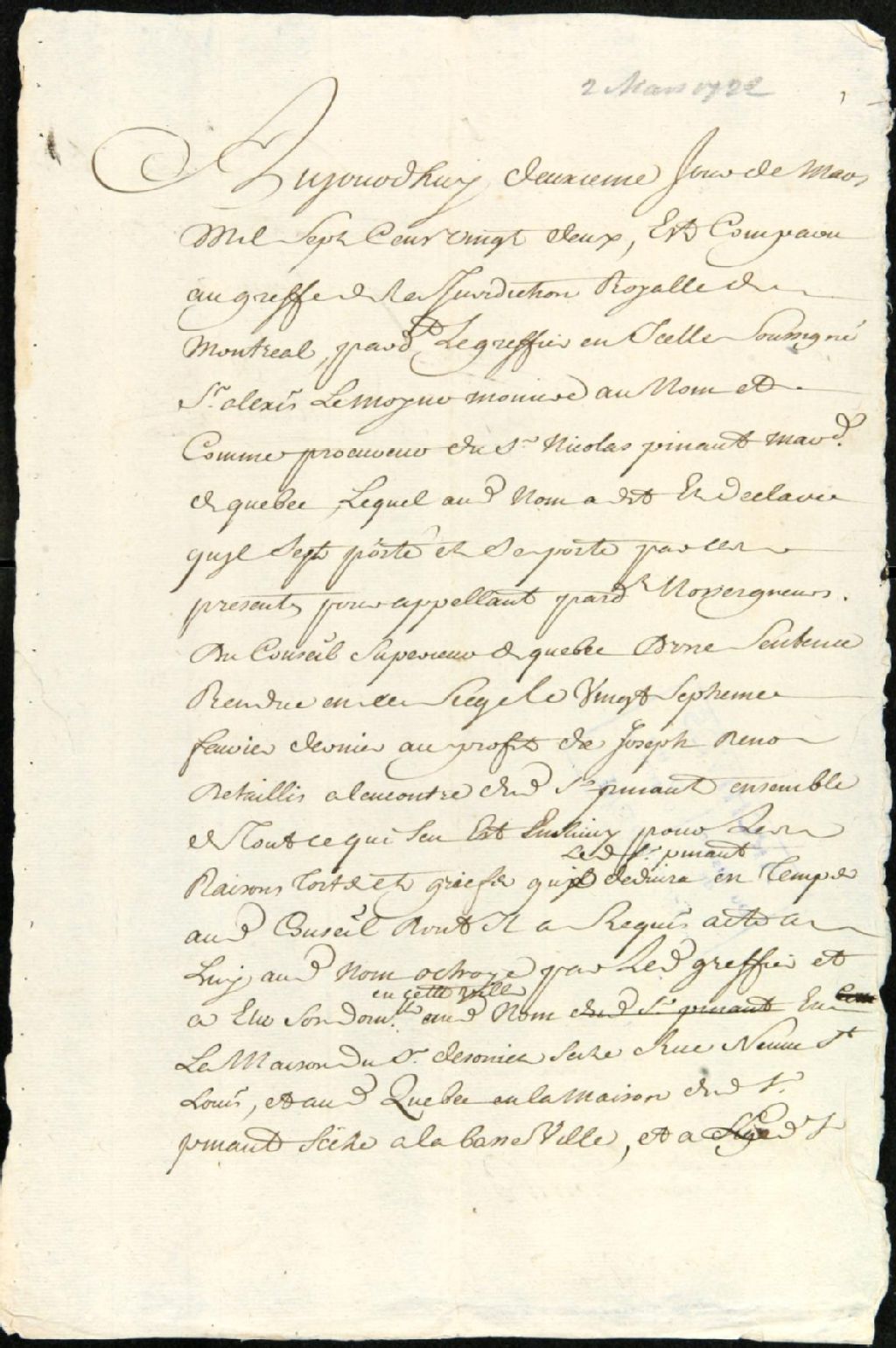 Ce dossier de matière civile est composé de la comparution d'Alexis Lemoine, sieur Monière, en tant que procureur de Nicolas Pineau disant se porter en appel d'une sentence rendue au profit de Joseph Deniau le 27 février dernier