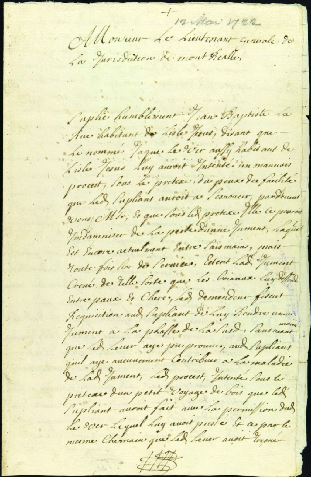 Procès entre Jean-Baptiste Larue, habitant de l'île-Jésus, demandeur, et Jacques Levert, habitant du même endroit, défendeur, pour la restitution d'une jument