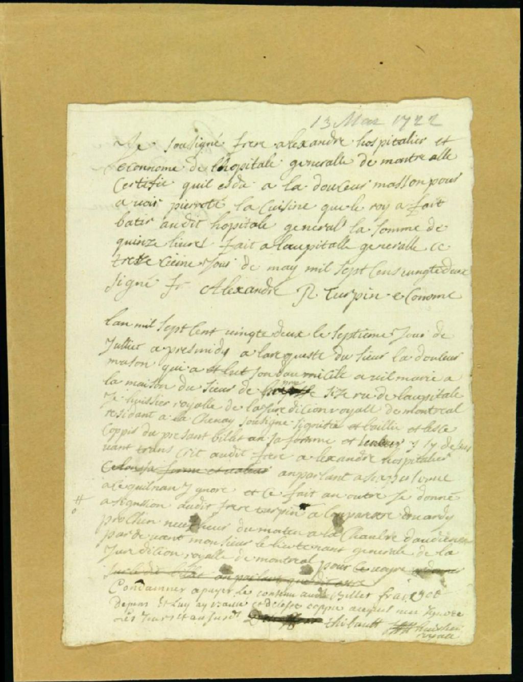 - Ce dossier de matière civile contient le billet signé de frère Alexandre Turpin, certifiant qu'il est dû à Pierre Martin dit Ladouceur la somme de quinze livres pour avoir " pierroté la cuisine que le roi a fait bâtir audit Hôpital général ". On retrouve aussi la signification du billet et l'assignation à comparaître à l'audience servie au frère Turpin
