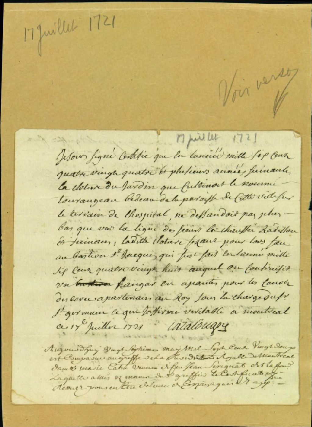 - Ce dossier d'administration judiciaire est composé du dépôt au greffe par Marie Catin d'un certificat daté du 17 juillet 1721, fait par Gédéon de Catalogne, précisant " qu'en 1684 et quelques années suivantes, la clôture du jardin cultivé par le bedeau Tourangeau sur le terrain de l'hôpital ne descendait pas plus bas que vers la ligne des sieurs Lachaussée, Radisson et Sincennes, ladite clôture faisant alors face au bastion Saint-Jacques, qui fut fait en 1688 auquel on a construit un hangar et appentis pour les canots du roi sous la charge du sieur Saint-Germain "