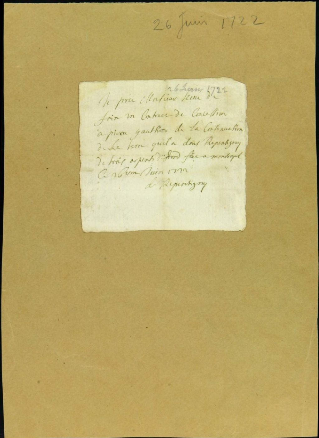 - Ce dossier de matière privée est composé d'un billet rédigé par de Repentigny et adressé au notaire Senet afin qu'il prépare un contrat de concession au nommé Pierre Gauthier pour la continuation de la terre qu'il possède dans Repentigny