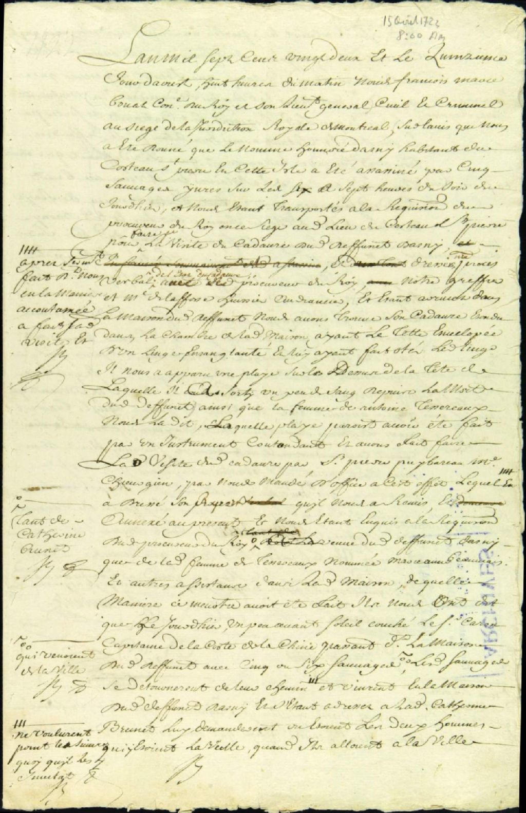 - Ce dossier de matière criminelle est composé des pièces suivantes : le procès-verbal de la descente au domicile d'Honoré Danis, située au Côteau Saint-Pierre, lequel a été assassiné hier soir par cinq sauvages iroquois ivres provenant de la mission du Sault-Saint-Louis ; les requête pour la tenue d'une information judiciaire, l'inhumation du cadavre et pour la prise de corps de Charles Leduc et de Joseph Pincourt ; le rapport du chirurgien Pierre Puybaro sur la mort de Danis et sur les blessures subies par son gendre, Charles Raymond ; l'information judiciaire tenue sur les lieux du crime ; le décret de prise de corps contre Charles Leduc, 52 ans, et Joseph Pincourt, 14 ans, soupçonnés d'avoir vendu de l'eau de vie aux sauvages qui ont assassiné Honoré Danis ; les interrogatoires de Joseph Desroches, prisonnier, et de Louis, sauvage iroquois de la mission du Sault-Saint-Louis, par l'intermédiaire du sieur de Joncaire, lieutenant et [...]