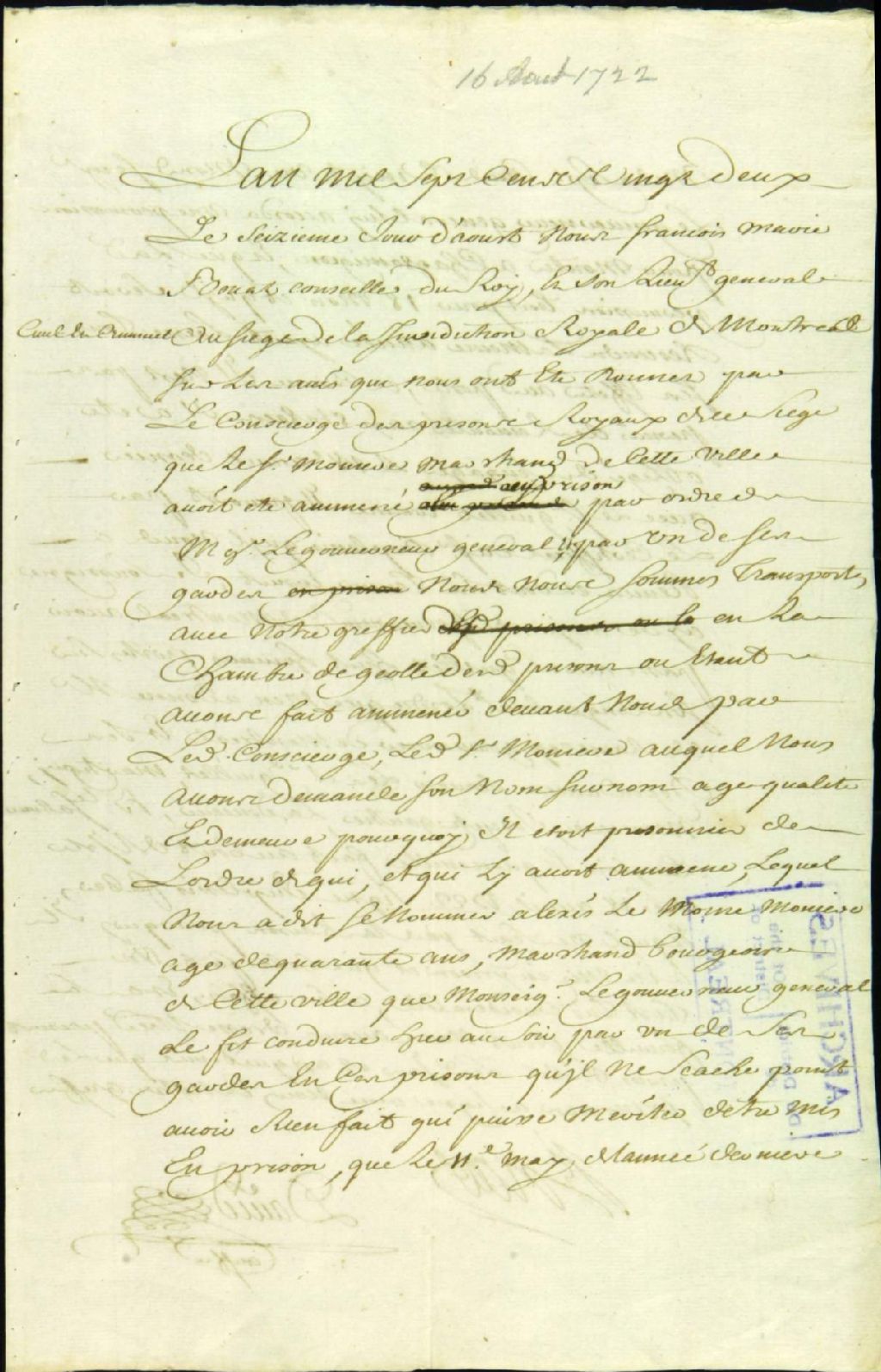 - Ce dossier de matière criminelle contient le procès-verbal rédigé par le lieutenant général lequel s'est rendu en prison sur avis du concierge des lieux, à l'effet qu'Alexis Lemoine Monière, 40 ans, y était détenu sur ordre du gouverneur. Le procès-verbal relate l'interrogatoire de Lemoine, lequel ignore les raisons de son arrestation. Un certain Guillet est cité comme engageur dans cette affaire