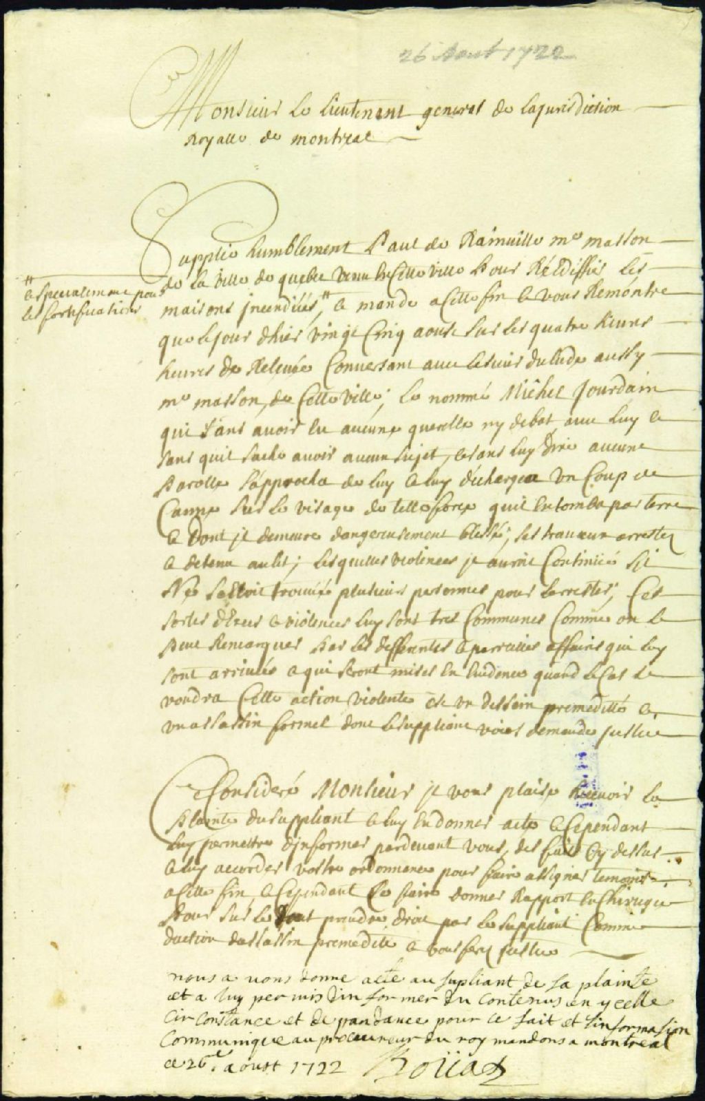 Procès entre Paul de Rainville, maître maçon de Québec, plaignant, et Michel Jourdain, accusé de voies de fait