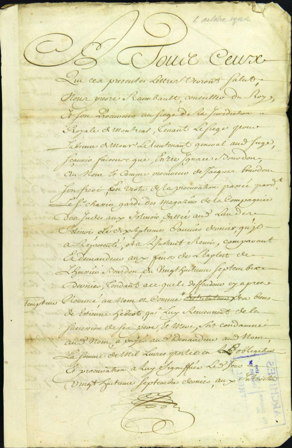- Ce dossier de matière civile est composé des pièces suivantes : la transcription d'un renvoi hors cour dans une poursuite intentée par Ignace Bourdon, en sa qualité de procureur de son frère Jacques Bourdon, contre Augustin Hébert, comme détenteur des biens de son frère Étienne Hébert, absent depuis bon nombre d'années, lequel lui doit une somme de 1000 livres tel que par contrat notarié passé devant Nicolas-Michel Chassin, garde-magasin et notaire aux Illinois ; l'ordre au demandeur de se pourvoir contre Étienne Hébert ; la signification à ce dernier, toujours absent ; la collation par Michel Lepailleur de l'acte passé le 17 janvier 1722 par le notaire Chassin ; la signification du jugement à Étienne Hébert, en parlant au sieur Laurent, élève du procureur du roi ; la saisie d'une partie de la terre de la succession des défunts Ignace Hébert et de dame Messier ; la signification de la saisie à Augustin Hébert ; et le jugement de saisie " bonne et valable ".Le dossier contient également : les affiches pour les criées, enchères et adjudication ; la requête de certification de criée par Ignace Bourdon ; la commission de Lepailleur et Adhémar à cet effet ; les oppositions de Michel Messier, sieur de Saint-Michel, pour trois années de rentes, et d'Augustin Hébert sur la distribution des biens provenant de la vente ; la procuration de Ignace Bourdon à Pierre Bourdon, habitant de Longueuil, passée par Jacques David, notaire ; la requête de sentence d'ordre ; la demande de Marie Ménard, épouse du notaire Jacques Bourdon, lequel est impotent, pour obtenir une avance de 200 livres représentant une dette de son fils à son égard ; la permission de faire saisir 200 livres de la somme déposée au greffe ; la saisie des argents en mains du greffier David par Marie Ménard ; le mémoire des frais de justice ; la requête de Pierre Girard, habitant du Cap-Saint-Michel, adjudicataire, pour déposer l'argent de son achat, soit 1620 livres au greffe ; la permission accordée ; la consignation de ladite somme ; la sentence d'ordre et la distribution ; et la quittance notariée de Pierre Bourdon envers Jacques David, greffier, par Michel Lepailleur, notaire royal. Les documents mentionnent Pierre Bousquet en tant que commissaire