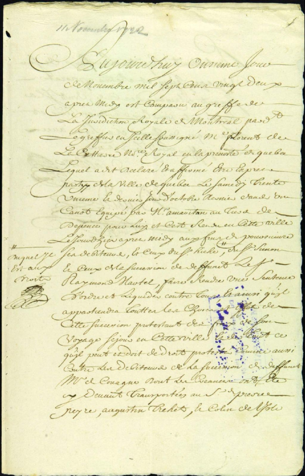 - Ce dossier de matière civile contient l'acte d'arrivée de Québec, par Florent de Lacetière, afin de poursuivre plusieurs débiteurs, dans la Juridiction royale de Montréal.La succession de Raymond Martel est citée
