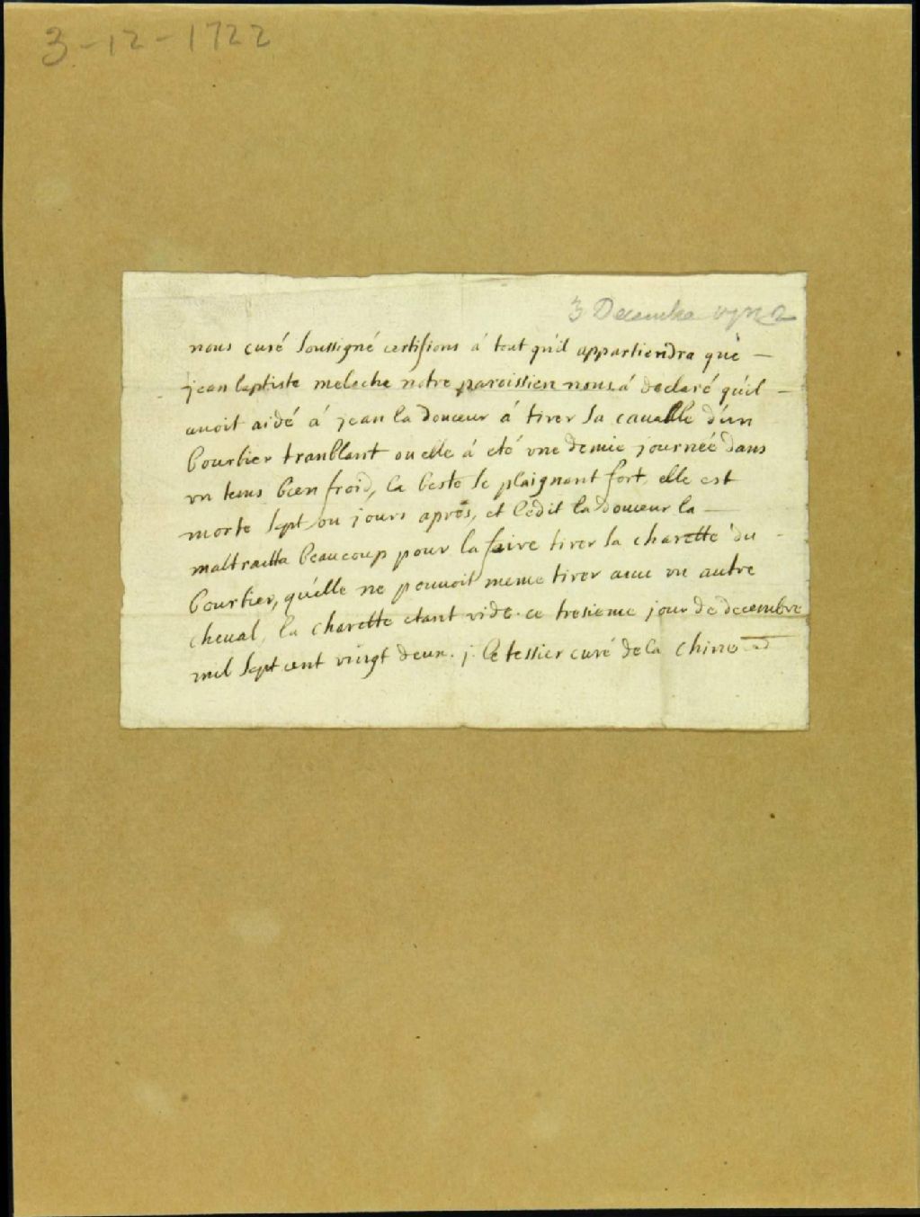 Certificat de Le Tessier, curé de Lachine, au sujet d'une cavale morte en raison de mauvais traitements, 13 décembre 1722, Archives nationales à Montréal, Fonds Juridiction royale de Montréal, (06M,TL4,S1,D2839).