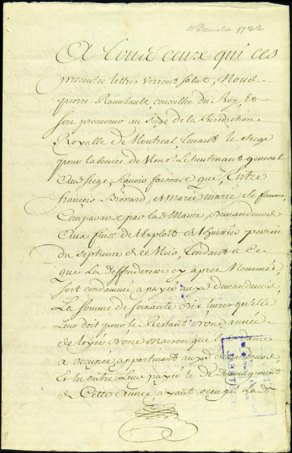 - Procès entre François Brossard, époux de Marie Marie, demandeur, et Louise Denis, veuve d'Ailleboust d'Argenteuil, défenderesse, pour le paiement du loyer d'une maison