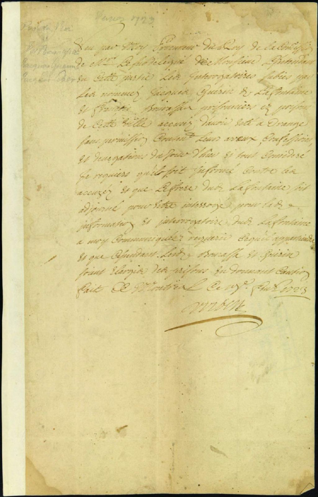 Ce dossier de matière criminelle est composé des pièces suivantes : les procès-verbaux des interrogatoires de Jacques Guérin, 25 ans, François Bourassa, 24 ans, et Jacques Leber, 23 ans, prisonniers, accusés d'avoir été à Orange sans permission ; le réquisitoire pour la comparution et l'interrogatoire de Jean-Baptiste Guérin et pour l'élargissement de Bourassa et Jacques Guérin ; et l'ordre d'interroger Jean-Baptiste Guérin et de relaxer Bourassa et Jacques Guérin